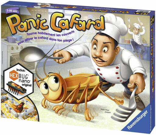 1 HEXBUG nano (1 pile LR44 fournie), 1 plateau de jeu en 3D muni de 18 couverts pivotants, 20 jetons Cafard, 1 dé, 2 portes, 1 règle du jeu